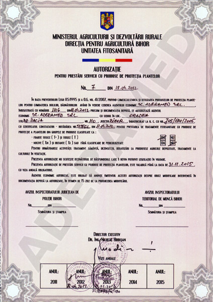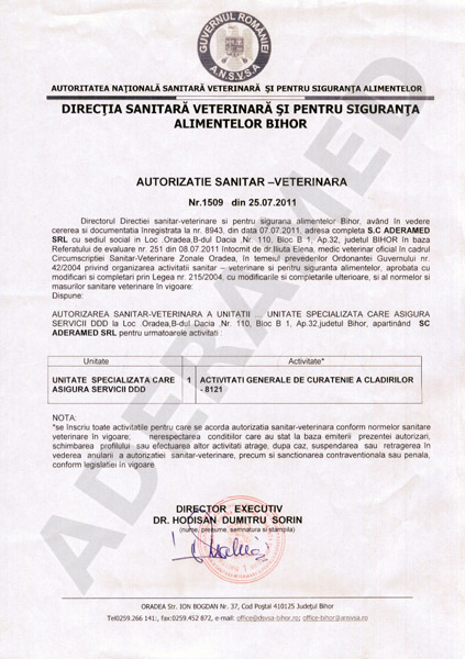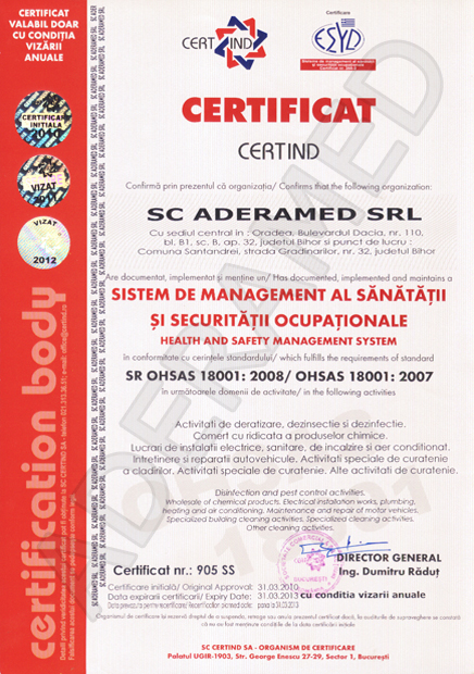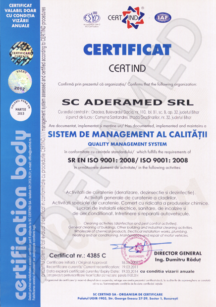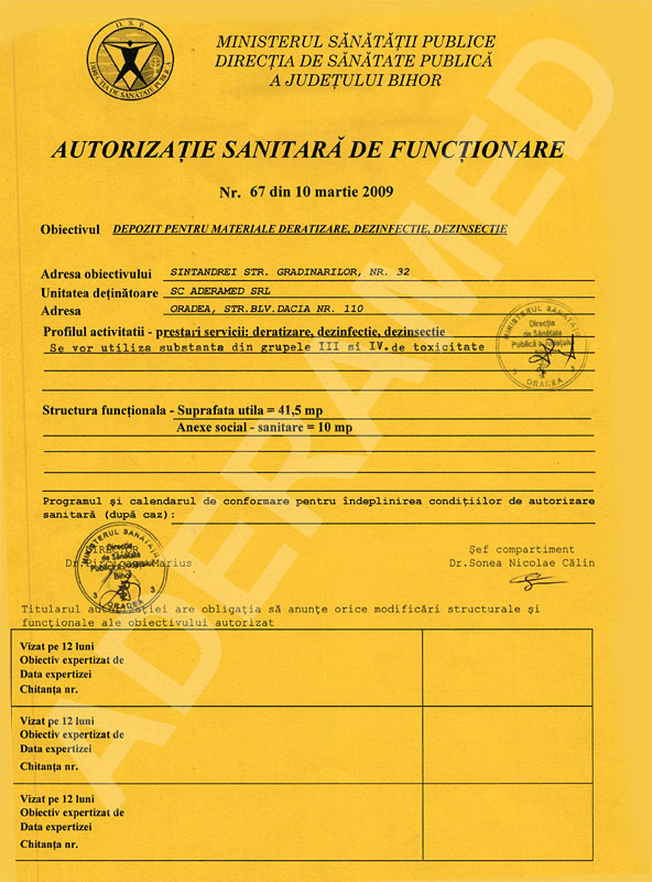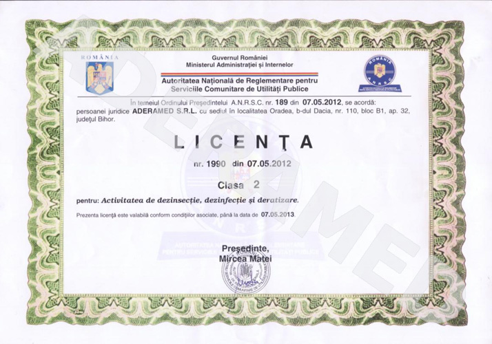 S.C. ADERAMED S.R.L. detine o vasta experienta in combaterea daunatoarelor de orice tip prin deratizare, dezinsectie si dezinfectie. Experienta de 14 ani fiind dobandita din numeroase lucrari de deratizare, dezinsectie si dezinfectie efectuate atat in judetul Bihor - localitatile Oradea, Salonta, Marghita, Beius, Stei, Suncuius, Valea lui Mihai, Baile Felix, Baile 1 Mai, Gepiu, Sanmartin, etc.; precum si in numeroase orase si localitati ale tarii apartinand judetelor: Arad, Brasov, Hunedoara, Cluj, Maramures, Satu Mare, Salaj, Sibiu, Tulcea etc. Suntem prezenti pentru deratizare, dezinsectie sau dezinfectie oriunde aveti nevoie de noi.