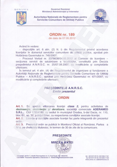 In vederea obtinerii unor rezultate optime personalul calificat al Sc. Aderamed Srl. executa deratizare, dezinsectie si dezinfectie NUMAI cu solutii din import aprobate si omologate de Ministerul Sanatatii si Familiei care satisfac cele mai exigente norme protective si siguranta alimentara, cerinte impuse de Uniunea Europeana si care nu pun in pericol viata oamenilor si animalelor prin folosirea in deratizare, dezinsectie si dezinfectie.