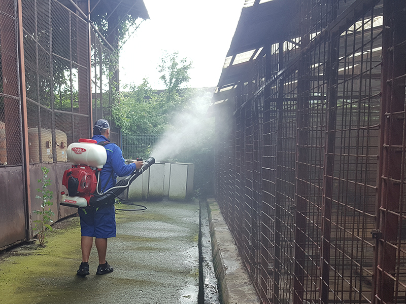 Operatiunea de dezinfectie se executa prin pulverizarea substantelor cu rol in combaterea germenilor patogeni, la nivelul suprafetelor infestate.